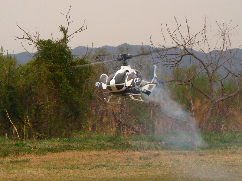 当時は毎回のように写真を撮ることなどはしていなかったので、滅多に写真は撮らなかったのですがたまたまI戸さんがスケールヘリを完成させたところを撮っていました。僕がヘリを始めた当時、I戸さんは滅多にお見えにならず、このスケールヘリの完成をきっかけによく出動されるようになったようです。このスケールヘリはEurocopter ec135を模したもので、90クラスです。ドア開閉式、またテールはシャフトドライブ駆動のフェネストロンです。未塗装のキットでも30万円超という高級品ですが、これ以外にもメカなど様々な補機類も必要だし、塗装するのも大変だったと思います。