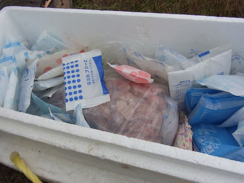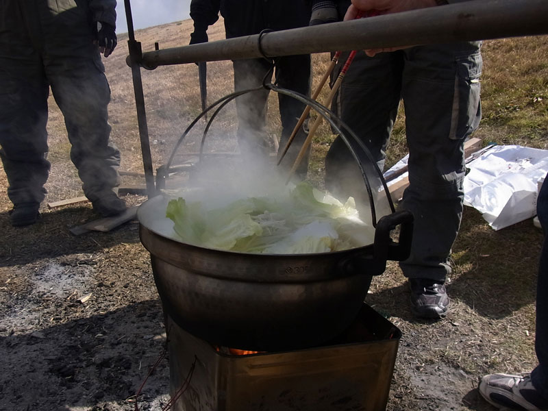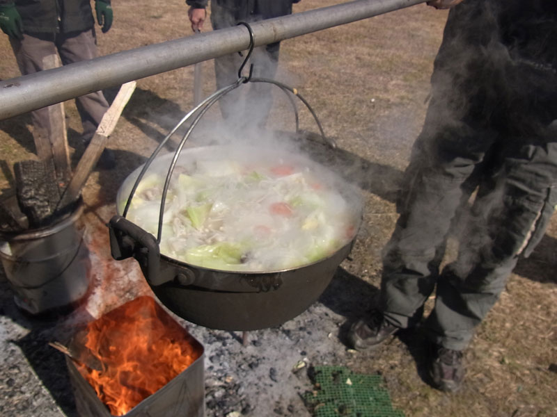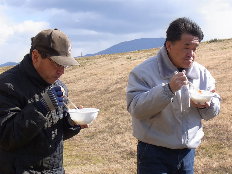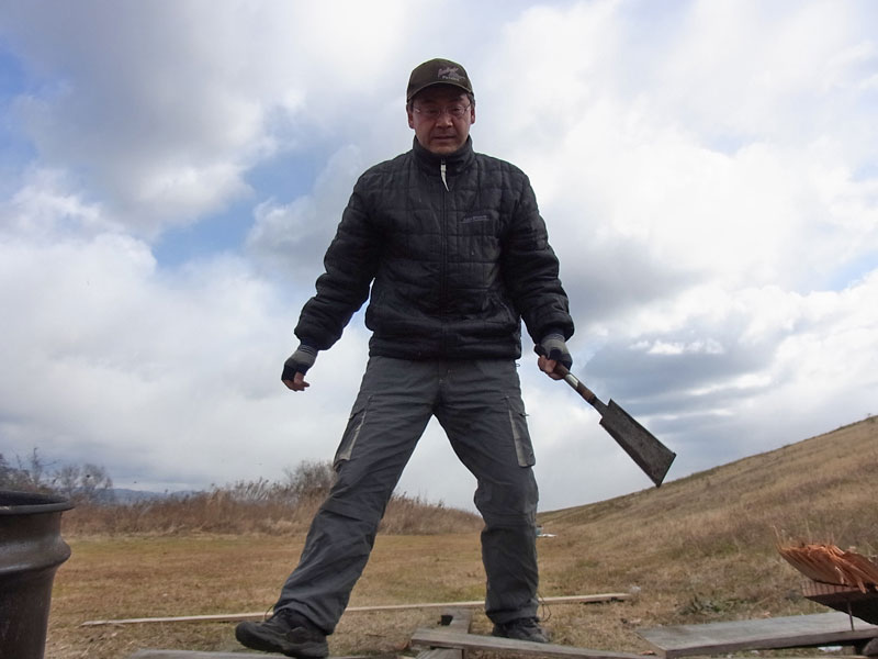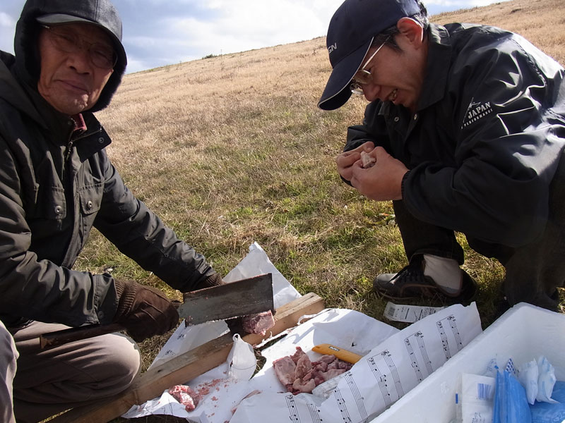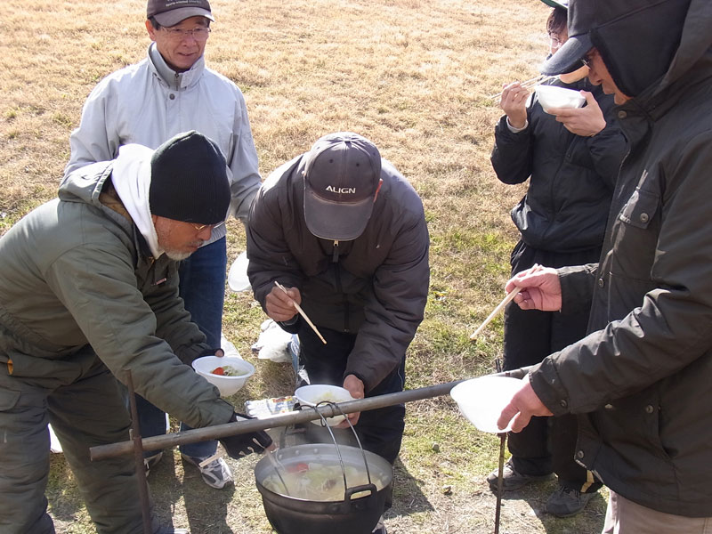 長野からはるばるお見えになったNセンセ、無事に帰れたんでしょうか…?今日は料理長にもご臨席賜りましたので猪汁準備は着々と進行。K2さんの猪肉は半分以上凍ったままでしたのでのこぎりとカッターで解体する、まさしく【男の料理】が展開。味の見極めはY2さんが行い、その後皆さんで美味しくいただきました
