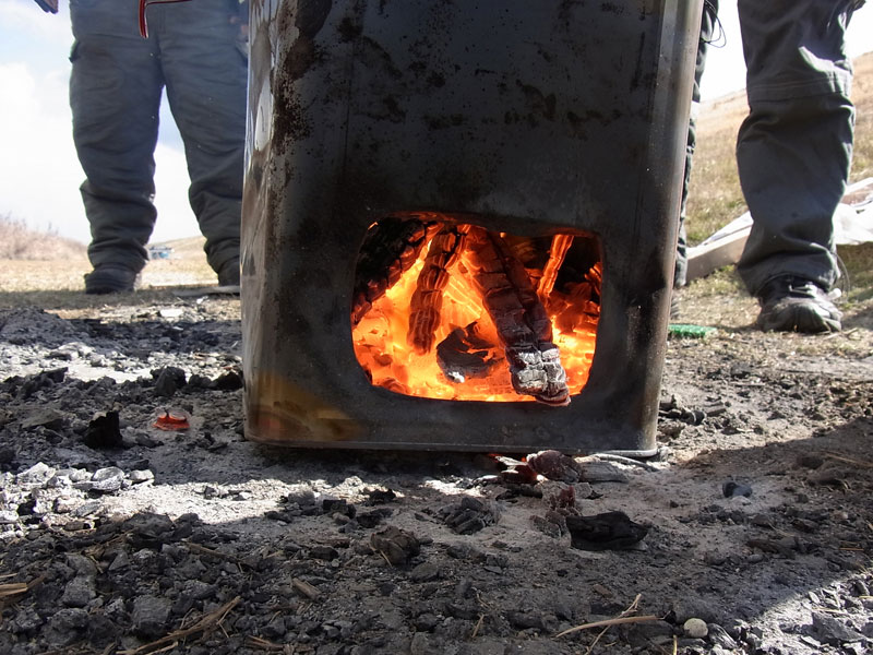の準備です(笑) N井さんがペール缶を持ってきてくれましたので一斗缶と併せて焚き火開始。強風なのでいい感じに燃えまくります
