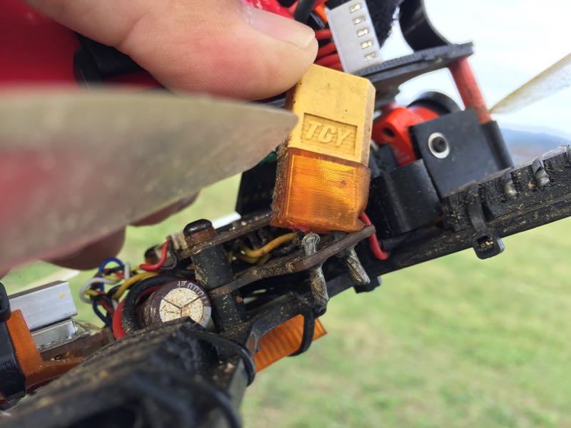 週末は仕事で連休もなく、仕方なく平日にふらっと練習しています。飛ばさないとすぐに忘れちゃうのでコンスタントに飛ばしておかないといけないなぁと思った次第。先日のフライトでSwift165はお尻から激しく墜落し、VTxのコネクタが飛んでしまう始末。家に帰って直そうかと思ったらコネクタもダメになってしまったのでVTxを載せ替えました。今日はA号機の1F目、ロールさせた途端にブラックアウト。電波が途切れてしまったのですぐにDisarmし不時着させました。よくよく見てみると電源コネクタ部が死んでます。先日から怪しいなぁと思っていたのですが、やはりここでした。結構負荷がかかる部分のようですね…(^^;;
