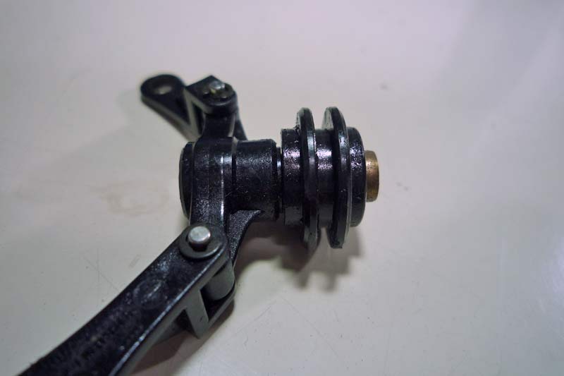 。それがこのピッチプレートASSY。ラダーコントロールロッドの前後の動きを左右の動きに変換するための大事な部分です。ピッチプレートは数点の部品からなるのですが、テールプーリー軸に対するスライド軸がかしめられた状態で出荷されています。半完成品のSDXはこのプレートが採用されていると思います(今現在はわかりません) ところがこのかしめられたASSYは結構早くにガタが来るようです。僕のSDXもガタつきがありましたが今まで見て見ぬふりをしてきました(笑)
