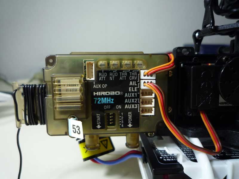 受信機やジャイロ、スピコンはすべて一体となって機体前方に鎮座しています。ジャイロ感度や舵角設定なども簡易ながらできるようになっていて、プロポをあまりさわらずとも飛ばすことは可能です。プロポ側で細かな味付けもできるようですが、よくわかりません(^^;;