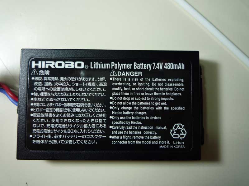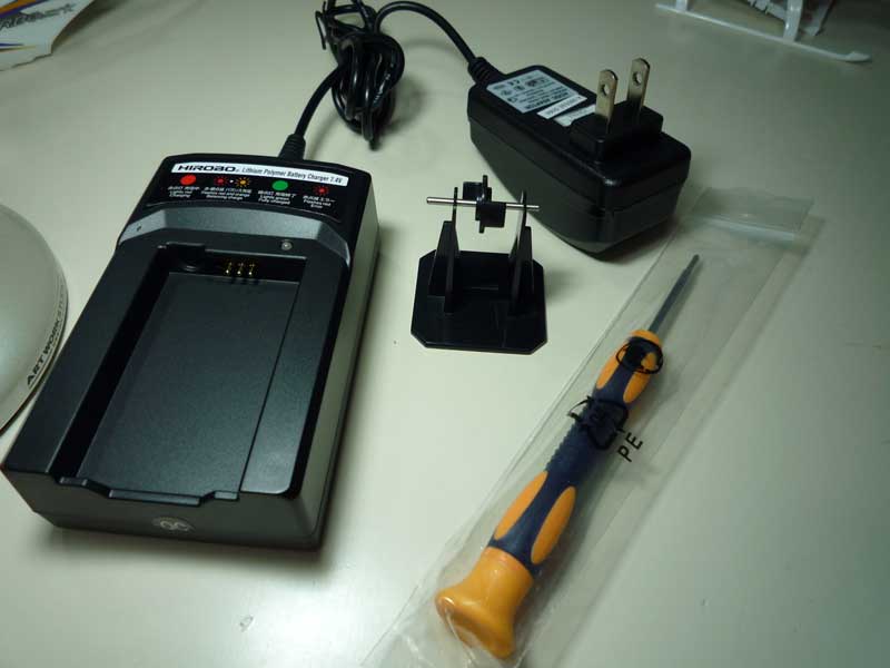 左:附属LiPo。2セル-480mAhです。右:バランサーまで付いた附属品一式。