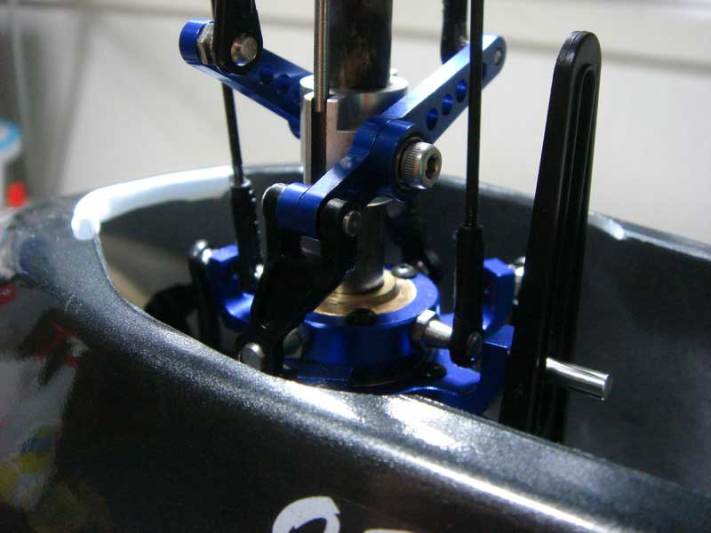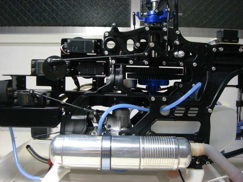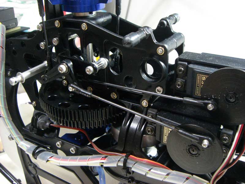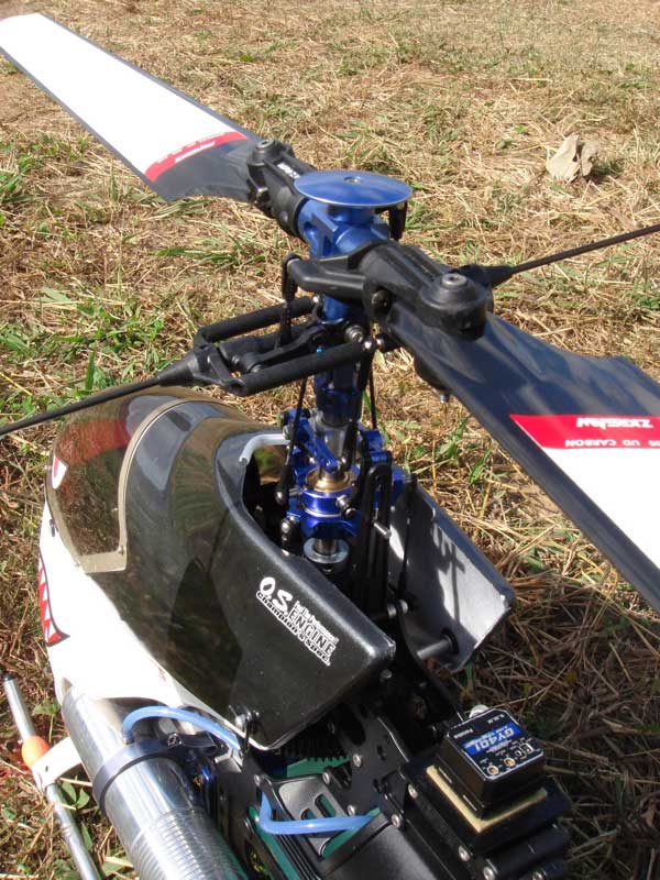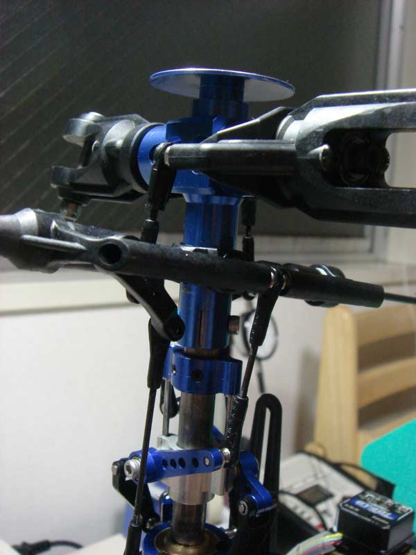 こちらはスワッシュ周り〜ヘッド部です。色々とオプションが付いていますが、小破のたびに少しずつ追加したものばかりです。クイック製のダブルベアリング SWMスワッシュプレート・ウォッシュレバー・ラジアスブロック・ウォッシュアウトベース・ワンピースセンターハブを使っています。ワンピースセンターハ ブはヘリ仲間のIさんに頂いたものです。グリップは樹脂のままですが、ナットを固定しやすいので変更していません。操縦感を語れるほどの腕は持ち合わせて いませんが、机上での調整時のガタは幾分減少しました。またキャップスクリューをステンレス製に変更しています。強度的には?ですが錆びなさそうなので変 更しています。ステンレス製のキャップスクリューはフレームなどを含め変更できるところはほぼ全てに渡って変更しています。あと、ローターはジグソー工業 ののGP4-600に変更しています。墜落で半分使えなくなった時に、これまたIさんが使わないからあげるといっていただいたブレードを頂き、バランスを 取って使っています。半年以上この状態ですが不具合はありません。