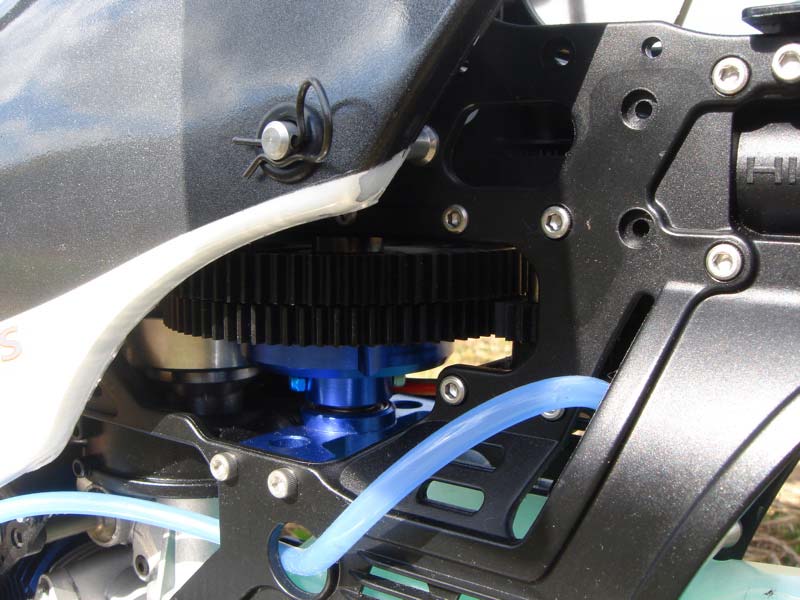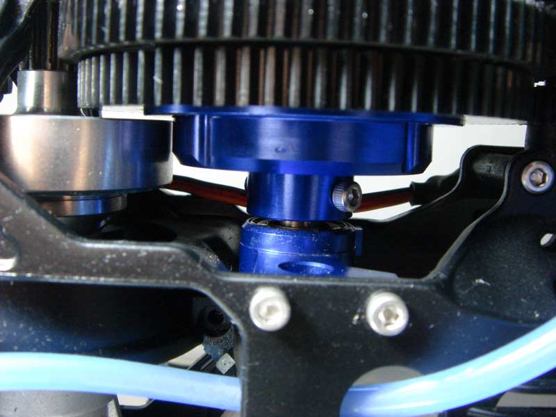 こちらはメインギヤです。もう製造を中止してしまったクイック製の メインおよびセカンドギヤに変更しました。ギヤ比の変更はしていません。もう一台のスカ ディーにはHIROBO純正のメインギヤを奢りましたが、HIROBO純正に比べるとややギア音は大きいような気がします。標準のギアよりは静かなので、 静かさからいえば「標準<クイック<HIROBOオプション」という感じです。セカンドギアにはブルーアルマイトが使われています。見た目もいい感じで す。その下に見えるのは、これまたクイックのロアーベアリングハウジングです。標準との違いはわかりません