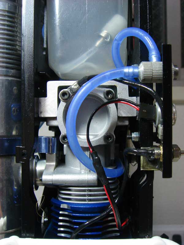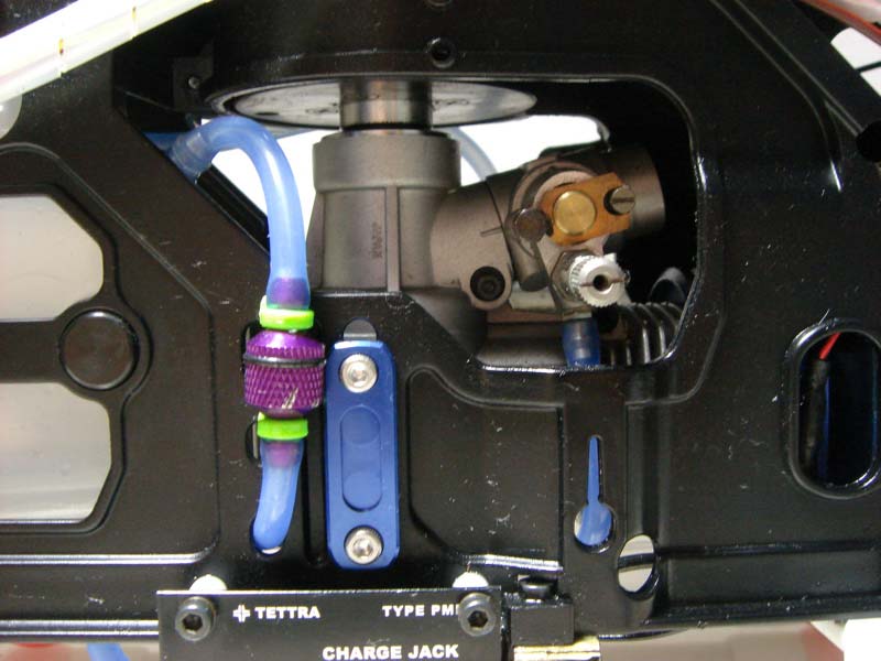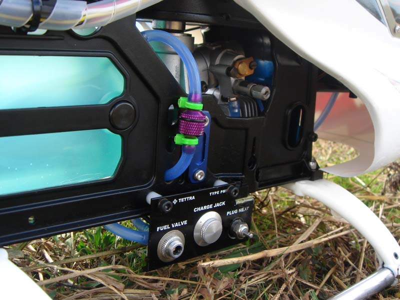 こちらはエンジン周り。OS製のMAX 50SX-H RING Hyperです。エンジンマウントをクイック製のプレートで補強してます。見た目重視です(笑) 下の方に見えるのはテトラ製のターミナルプレートです。 バッテリ端子・給油口・プラグヒートが一体になった優れものです。バッテリ端子はあまり使わないのですけどね・・・。