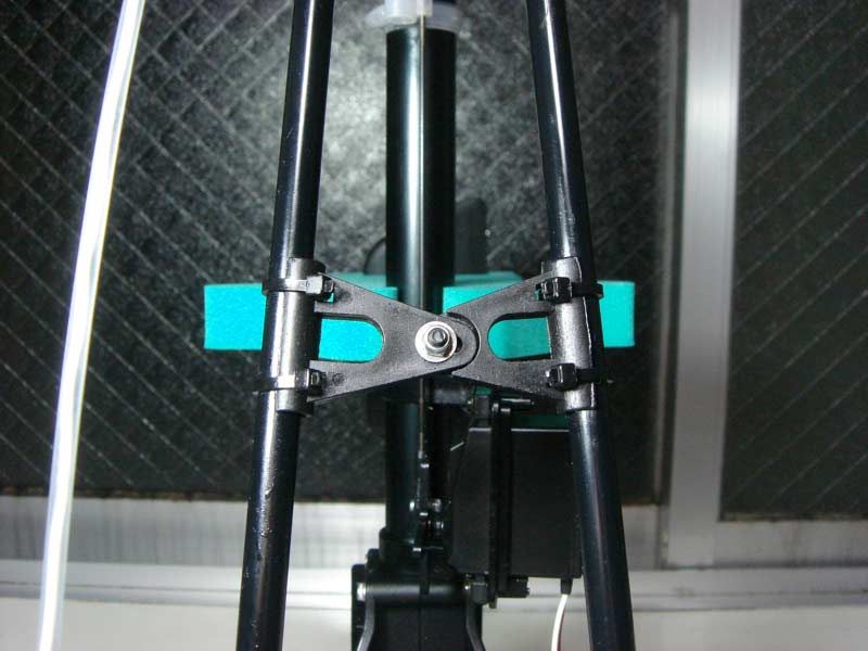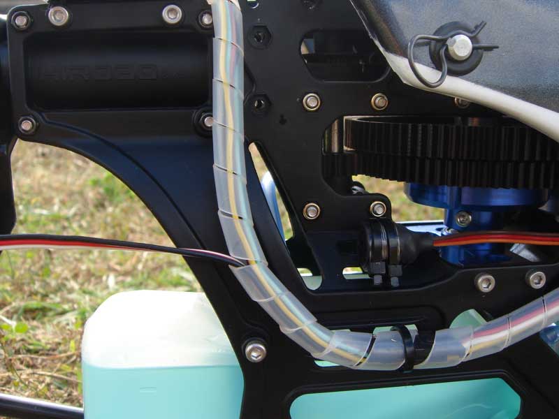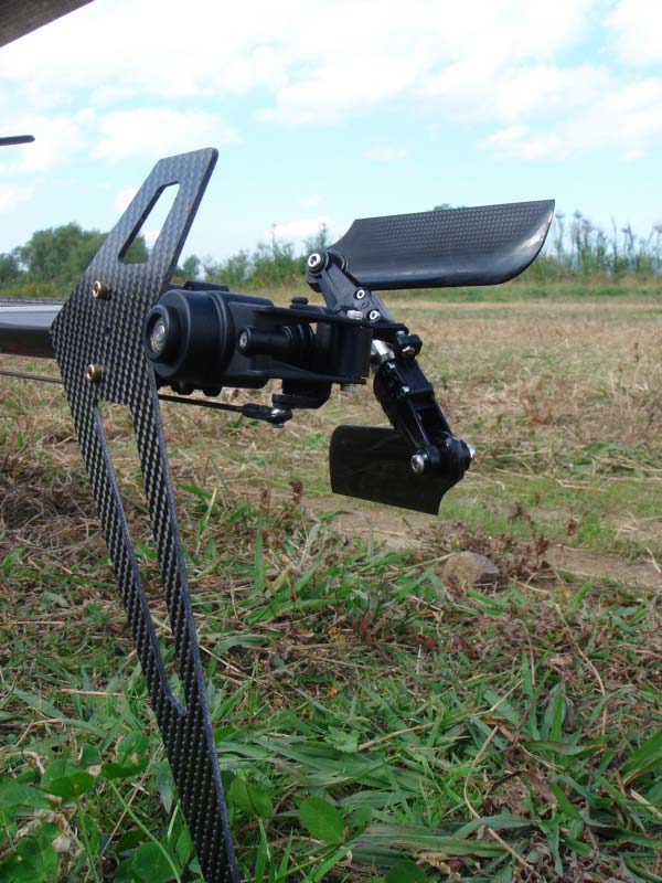 こちらはテール周りです。テールブレードホルダーはフレイヤ用のものに変更しています。テールブレードはK&Sの カーボンテールローターです。垂直・水平尾翼もK&S製のカーボンテールフィンセットを使っています。テールローターの変更は初心者の僕でもかな り違いがわかります。3ベアリングになったのでがたつきはほとんどなくなり、操縦時においてもピシッとした舵の切れがわかります。テールブームブレースは 純正のアルミ製ですが、播磨ヘリクラブの管理人さんのアイデアを拝見し熱収縮チューブで覆い黒化、カーボン風に見せています。さらにK&S製のテールサポーターブリッジで固定しています。