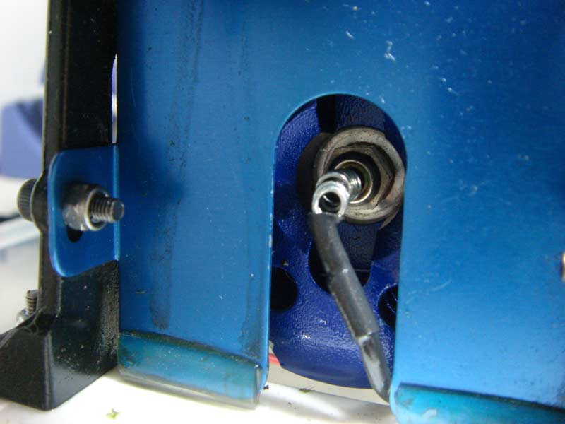そして裏側。ターミナルの裏はこんな感じです。プラグのアース線は市販のコードに付け替えました。端子も全て半田付 けし、外れにくくしています。また、プラグ側の端子はF3Aなどで良く用いられているらしい、キックバネを利用した端子です。バネの力でプラグにしっかり と噛みつき外れません。エンジンヘッドを覆っているブルーのプレートはMプロダクト製の強化ファンカバーです。冷却効果はよくわかりませんが、キャビンへの油汚れは減りました。