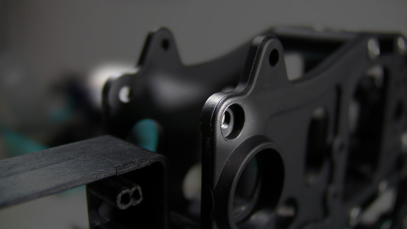そして次に気づいたのがフレーム前上端のボルト取り付け部分でした。スカディーだと樹脂パーツの出っ張りを左右勘合させることによってフレーム同士を直接 繋ぐのですが、どうみてもその部分がありません。ボルトは入りますが、クロスメンバーがないと左右を合わせるのは困難です。そこではたと気づいたのです。 こりゃおかしい