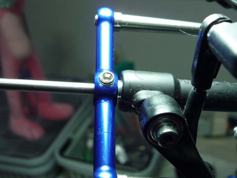 そしてヘッド周り。スタビバーを通していなかったので、スタビバーを通してヒラーコントロールアームを固定。クイックのオプションパーツですがやはりがたつきは以前と同様。結局3x6x0.5平ワッシャを左右合計4枚かましてほぼ解消。このあたりの加減はまだよくわかってません(笑)