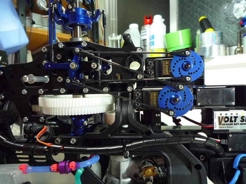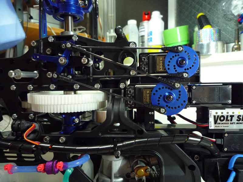肝心の調整ですが、とりあえずスロットルよびラダーリンケージ以外のリンケージはすべて外し、【説明書通り】 に組み立てました。プロポの設定はトリムはもちろんのことピッチ関連の設定をすべて初期化し、スティックをニュートラルにすることでサーボのニュートラル を出すようにしました。組み立てに際して実際にはサーボのギア穴位置が微妙に違うなどするので、こうした部分は一対のリンケージを同じ分だけ長くしたり短 くしたりして調整しました。レバーやアームの角度などに関しては目視しかできないのですが、とりあえず説明書通りに組み立ててみました。