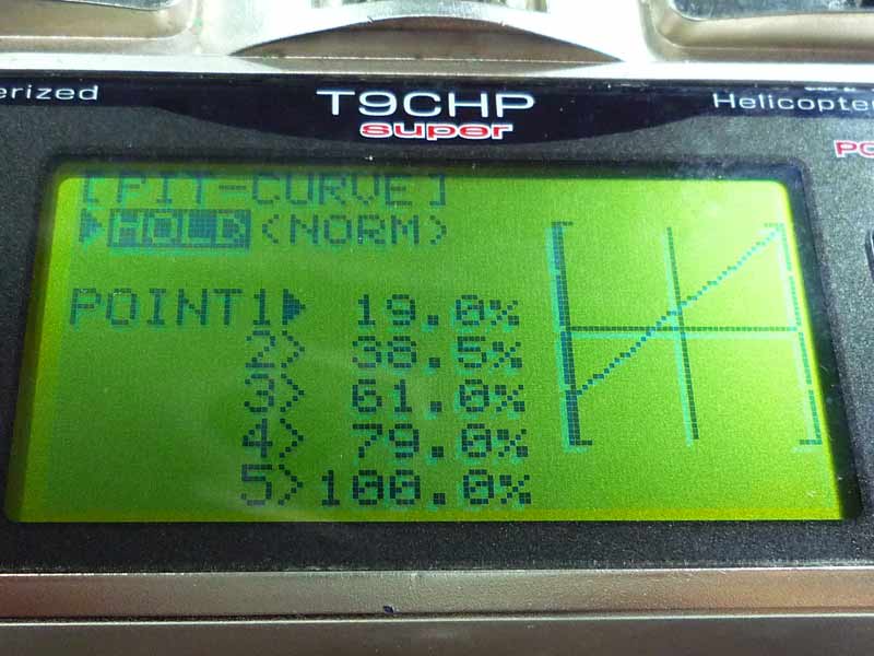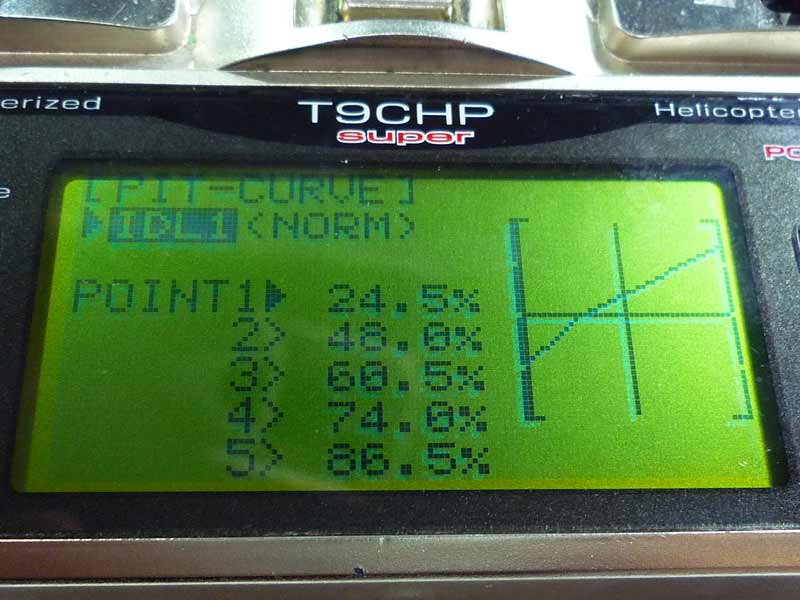 サーボホーンは以前から使っているトリムコーポレーション製なのでボールジョイントの位置決めは問題なく、また、サーボに対する角度調整も自由自在なのでセレーションを合わせる必要がなく便利です。次にプロポ側の設定です。ノーマルモード・アイドルアップ1・アイドルアップ2・ホール ドをそれぞれ設定しました。ノーマルモードはLow -3°、Hover 4.5°、High 8.5°とし、アイドルアップ1は Low -4°、Hover 3°、High 9°としました。アイドルアップ2は同様に-5°、1°、7°に設定。今回僕が組み立てたスカディーではピッチカーブ0%で-10°、100%で11°く らいが限界のようです・・・。今回は手元にあったK&S製のプラスチックピッチゲージを使いましたが、HIROBO純正のピッチゲージだとまた 違った測定結果になるのでしょうか・・・?トランクに入れっぱなしでしたので、また今度降ろして測ってみることにします。
