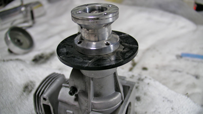 ビスが刺さっているため、なかなかクラッチが外れませんでしたがなんとか降ろせました。簡単に分解点検してみますが、まだ新しいエンジンのためかピストンも新品同様、その他も非常にきれいです。最初、間違ってスリーブをはずしてしまいあわてましたが、RC AIR WORLD4月号にちょうどOS50エンジンの分解・組み立て記事が載っていたので早速参考にし、事なきを得ました