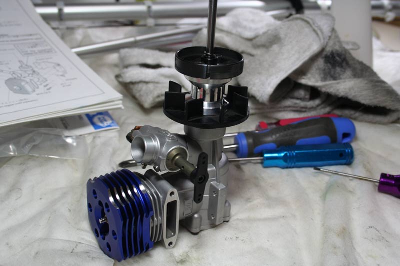 フライホイールの締め付けに際しては軸が共回りしてしまうので少々難儀ですが、クランクシャフトクランプが手元にないので液体ロックでがんばります。プラグを締め、キャブを全閉にし、ピストンを下死点の状態にします。そして排気口から燃料やオイルなどの液体を注ぎ込みシリンダー内を満たします。今回は油汚れ がいやだったこともありメタノールを満たしてロックさせました。空気と違い圧縮がかからず勢いさえ付ければ十分に締め付け可能です。こうして無事フライホイールとクーリングファンをセット。その後クラッチを取り付け機体に仮組みしておきました。