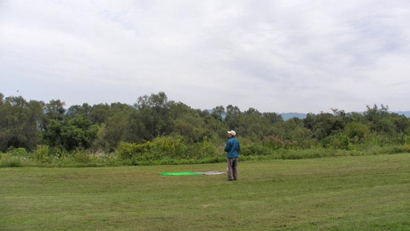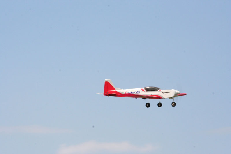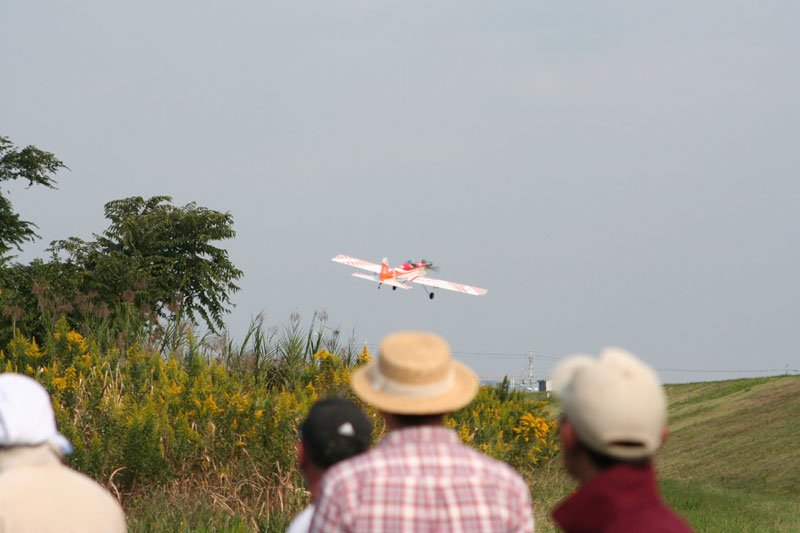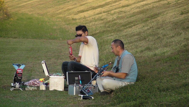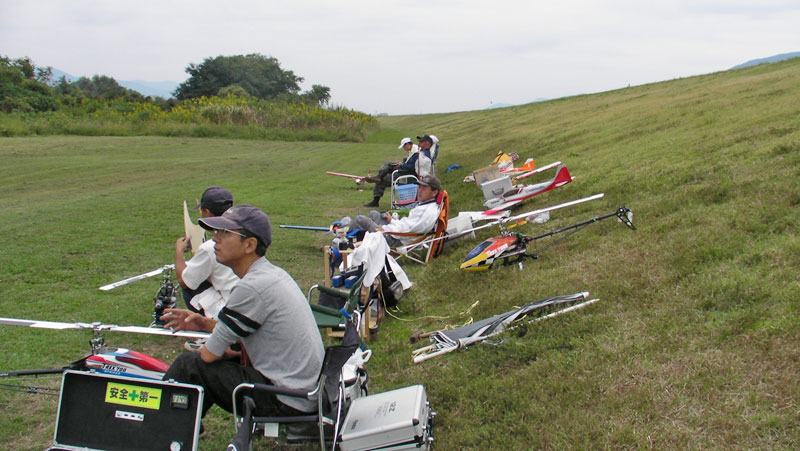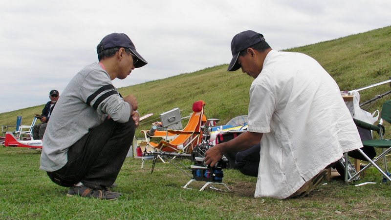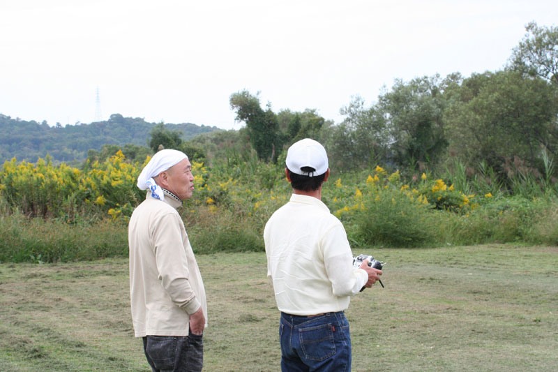 朝から曇り空。天気予報は晴れとのことでしたが、雨でも降るんじゃないかという雲行きの時もあり少々心配に。朝のうちに研究会があったので顔だけ出して飛行場へ。ちょうど草刈りが始まったところでした