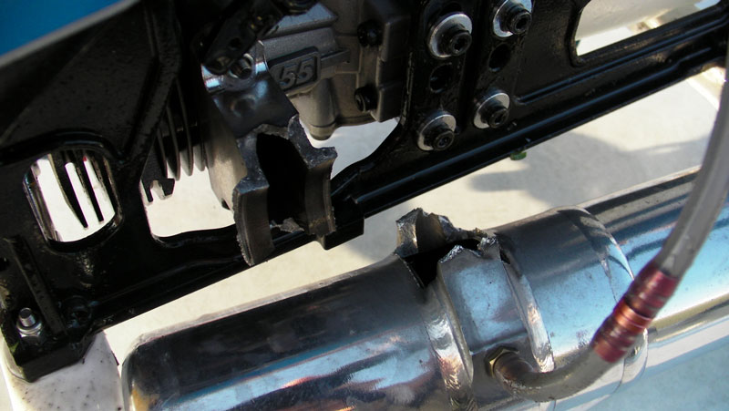 さて、今日は日没近くまでフライトしたのですが、最終4F目、風向きが逆だったのでいつもとは違う進入でオートロを練習。ところが、最後の最後に突然エンジン音が一気に甲高くなりました。最初はギアでも逝ったのかと思いましたが、舵は効いています。HOLDに入れても、ものすごい爆音です。どうやらまたマフラーが外れた…と思いきや、