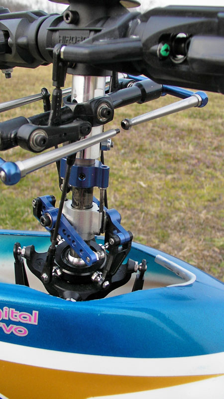 壱号機のオートロは調子よかったものの、途中メインローターを軽く叩いてしまう事態に。しかしZIGSAWのGP4は強いのか、全く問題なく使えるレベ ルでした。スピンドルやスタビバーも問題ないレベル。ところが、再度ホバリングさせてみると異様な方向に機体が傾いていきます。降ろして確認するとスティックニュートラルで、スワッシュが明らかに傾いています。ギアが欠けたわけでもなく、リンケージの損傷も無し。???と思っていると、どうやらトリムコーポレーション製のアルミサーボホーンのテーパー部分がずれてしまったよう。家に帰って調整し直しです。