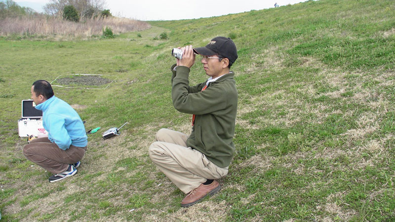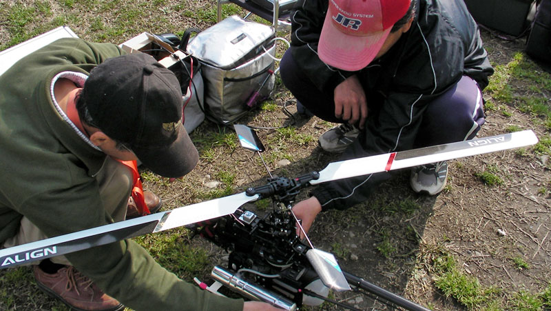 飛行場に着くとJYALAさん、K2さんがフライト中でした。しばらくしてY3さんが様子見に到着。そそくさと初号機に火を入れ隅っこでホバリングさせてみます。やはりジャイロユートラルは大きく狂っていたのでリンケージロッドの長さでニュートラル出しに専念。ピッチは若干ずれているようですがフライトに支障なさそうな範囲かと思いました。何せ時間がありません