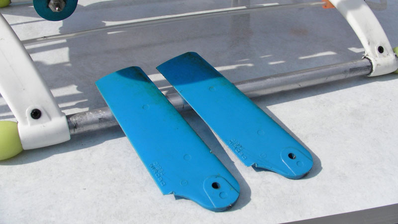 。スキッドは折損、また垂直尾翼は折損気味でした。幸いなことにヘッド周りは大丈夫そうです。スタビバーも大丈夫ですしメインローターもオッケーのようです