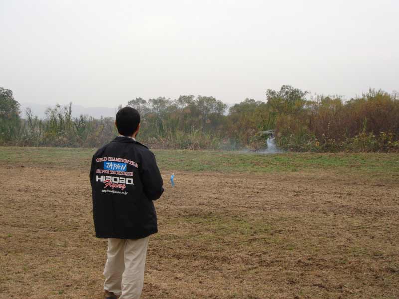さて、約2ヶ月ぶりにお会いするYさんに急かされてフライト。エンジンの調子はまずまずのようです。ホバリングからフルハイにしたとき若干回転の上がりが 遅いような気がしますが、調整できそうな範囲です。ホバリング・対面ホバリングをひととおりしてから上空へ。8の字旋回ののちストールターンを少々練習し ました。しかし軸が決まらないのでこっちを向いて帰ってくるときあらぬ方向へ飛んでいくこともしばしば。まだまだ修行が足りません。