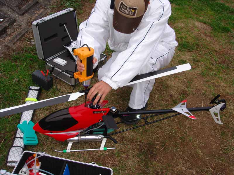 Yさんは愛機の真っ赤なスカディーを駆って上空へ。いつの間にかこのスカディーにはHIROBO純正のメインギア・セカンドギア・カウンターギアが取り付 けられています。随分お金もかかっているようです。しかも最近流行らしいFUNTECHの3Dローターまで取り付けてありました。このローター、一部カー ボン柄が見えるというなかなかのデザインで取り付けてみようかと思わせる一品でした。