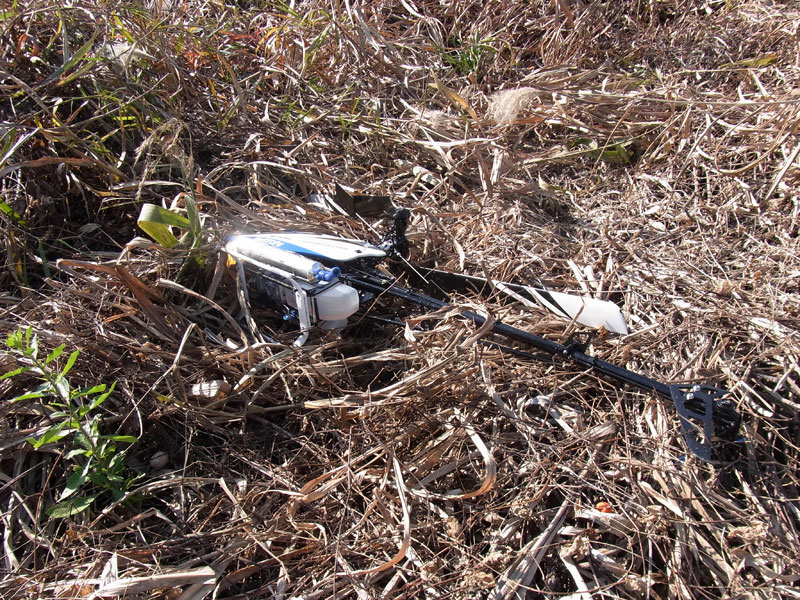 ガバナーONの状態でしたので、ノーマルだとは気づきませんでした。このときのマイナスピッチは-4.5°程度でしたが、設定は1550回転だったので上昇するほどの力はなかったようです・・・orz 一人寂しく回収へ出発。普段立ち入らないような方向に落ちましたが、何とか無事回収。テールローターの破損のみで済みました。メインローターやスタビバー、ヘッドなども無事です。テールローターを交換後確認飛行させてみたところ問題なさそうです。結局初号機は2Fで終了。