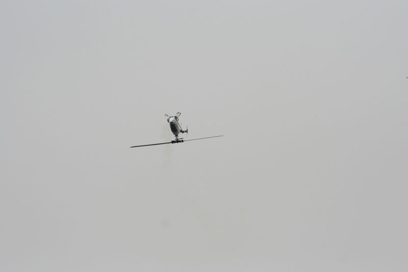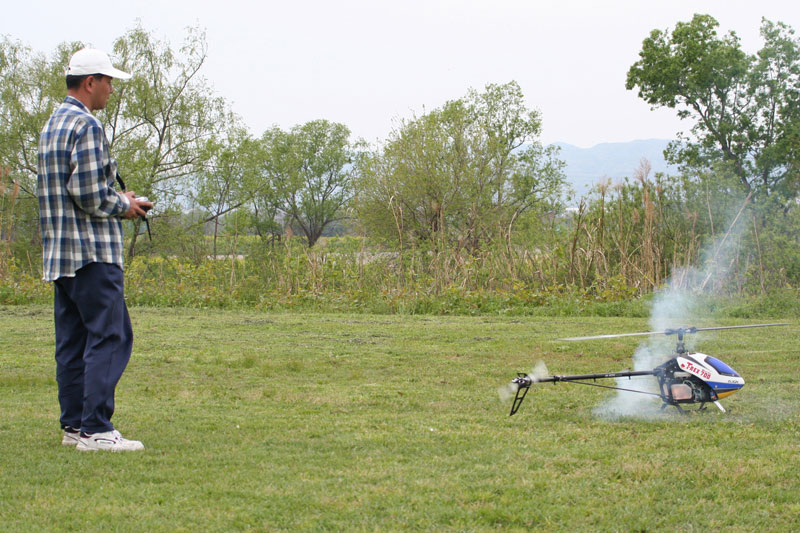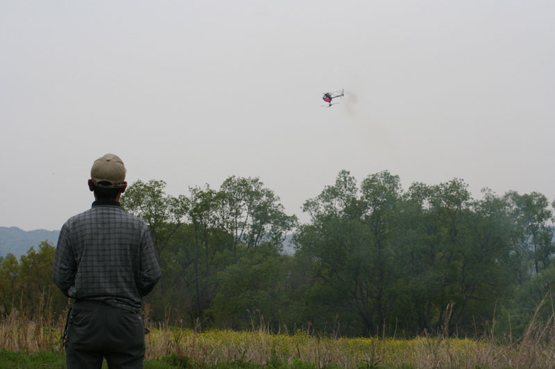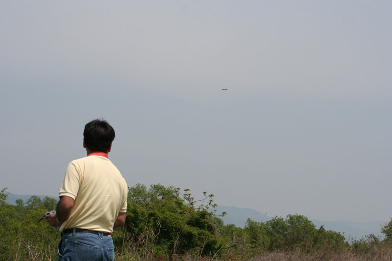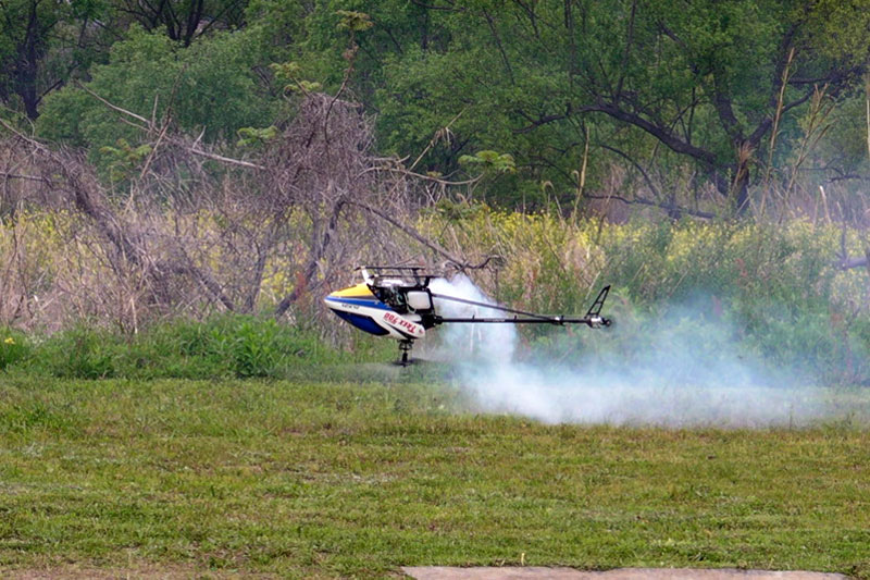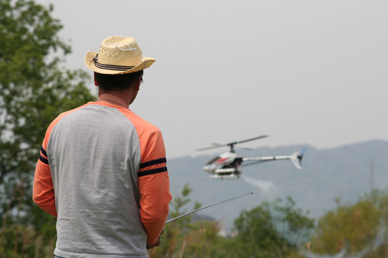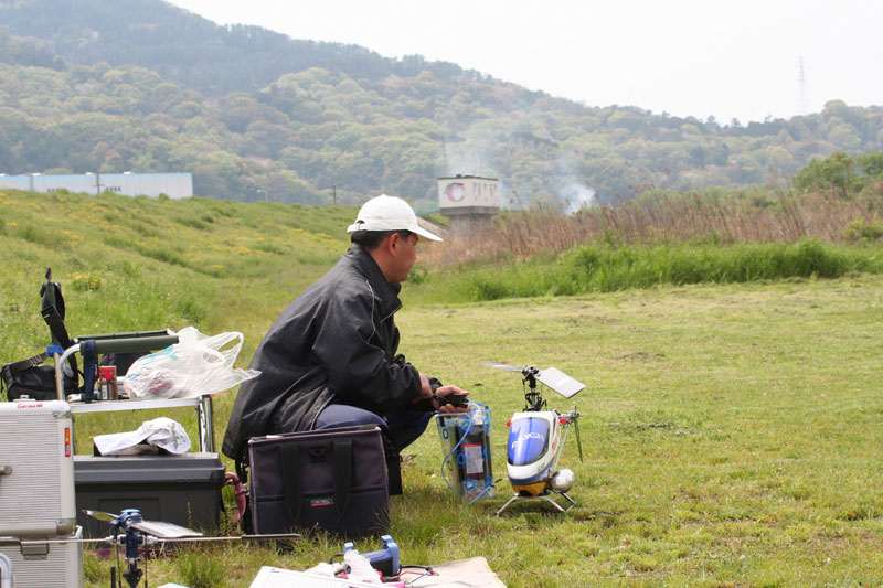 皆さんに申し訳なく思いつつ、広くなった飛行場の端で弐号機のホバリングから開始。お天気も良く、風もあまりないので飛ばしやすいです