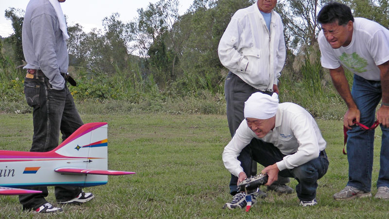 途中、K2さんのお客さん一家がギャラリーとして登場、一段と賑やかになりました。初号機はシーソー修正後のためまずはざっと調整フライト。基本的に問題なさそうですが、どうやらラダーニュートラルがおかしい様子。リンケージを取り直したところ問題なくフライトできました