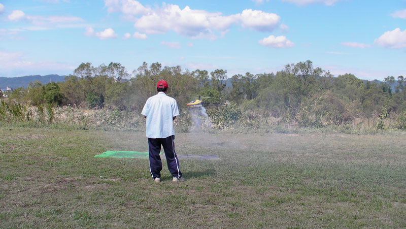 今日少し遅めで登場したのはJYALAさん。T-REX700N壱号機をひっさげて登場です。ところがいつもと違い、スロットル回りの調子がおかしい様子。イマイチパンチのない飛ばし方だったようです。結局はガバナーのトラブルだったようですが、メカトラを疑いつつ飛ばすのは怖いですよねぇ・・・。今回 初お目見えのストリートアンプTAXI 30を用意して使っていただきましたが、おおむね大丈夫だったようです。ただ【音楽がうるさくてエンジン音が聞こえにくい