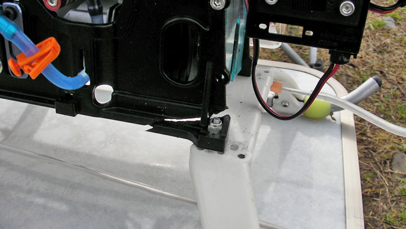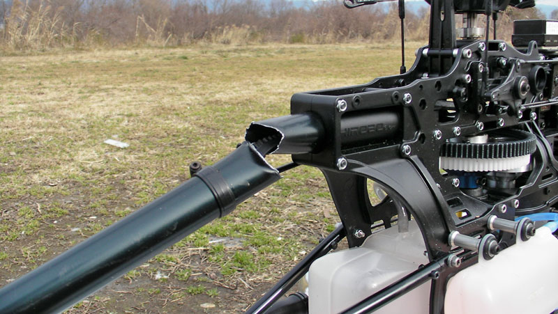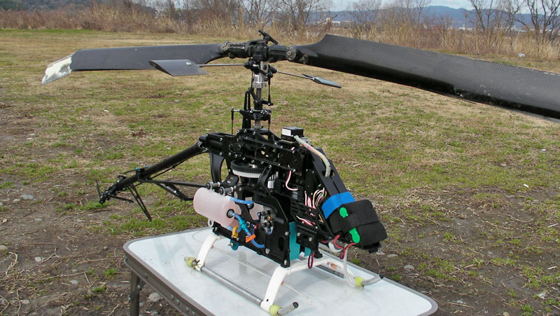 。幸い、スロットルはすぐカットできましたがかなりの重傷です。今年入っての初墜落(ほとんど飛ばしてないのでかなりの高率)はこんな激突で幕を開けたのでした・・・orz回収後の確認では、ヘッド周りは全損、テールもパイプが破断するなど重傷です。フレームは大丈夫かな?とおもいましたが、スキッド取り付け部の右前方がパックリ・・・