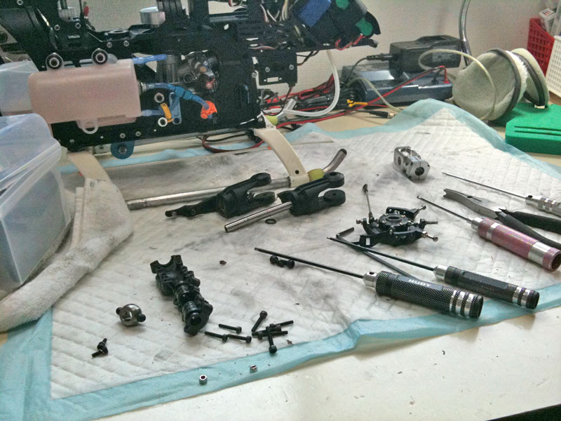 弐号機を飛ばす気力もないまま帰宅。早速バラします。アーム系が飛び散ってしまったようで紛失したものもあり、ベアリングごと買い直しです・・・(涙)軸物は当然ダメ、センターハブは迷いましたがとりあえず中古のままでいくことに(笑)フレームも買わなければいけなかったのですが、なぜかすっかり忘れてしまいました。また買いに行かないと・・・。結局ざっと見て1万円程度の破損状況。ローターを入れると諭吉さん1.5人分くらいでしょうか。週末には間に合わなさそうですが、何とか来週には調整飛行に挑みたいと思います・・・。