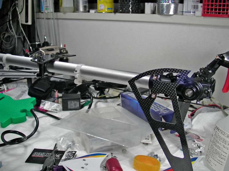 その後I店主の元へパーツ調達。ジャイロ感度を上げるためにサーボホーンの穴位置を変えてみてはと のアドバイスを受け、今までの軸中心より19mmの位置から13.5mmに変更し穴開け。サーボ位置も一段高く固定しロッドを水平に保つようにしておきま した。なぜか前オーナーの手によってコントロールロッドガイドが4つに増えていたので、説明書通りに間隔をそろえ、3つに変更。ついでに水平垂直尾翼をス トックしていたT-REX600用のカーボンパーツに変更。水平尾翼はかなり小さく、あまり意味をなさないような感じです。3D用という感じでしょうか。安いのですが、K&S製のものに比べるとカーボン板の厚さが薄いです(笑) T-REX700用のものだともう少し厚いのでしょうか?