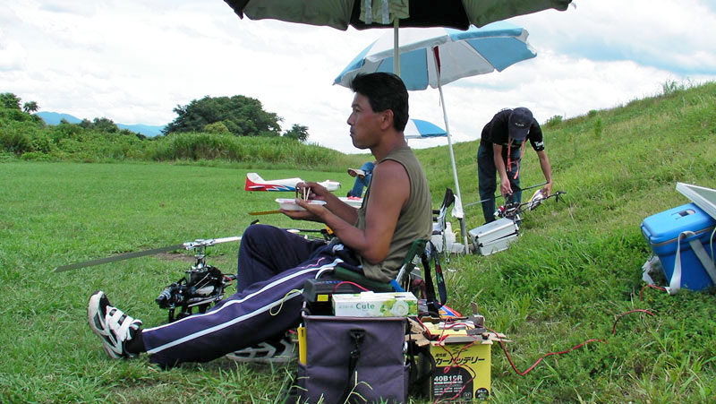 お盆前の休日、飛行場は朝から結構な賑わい。僕は午後から所用のため少し早めに出動。飛行場にはすでにJYALAさんが。早い!そうこうしているとK2さん、そして珍しくI店主が早出で登場