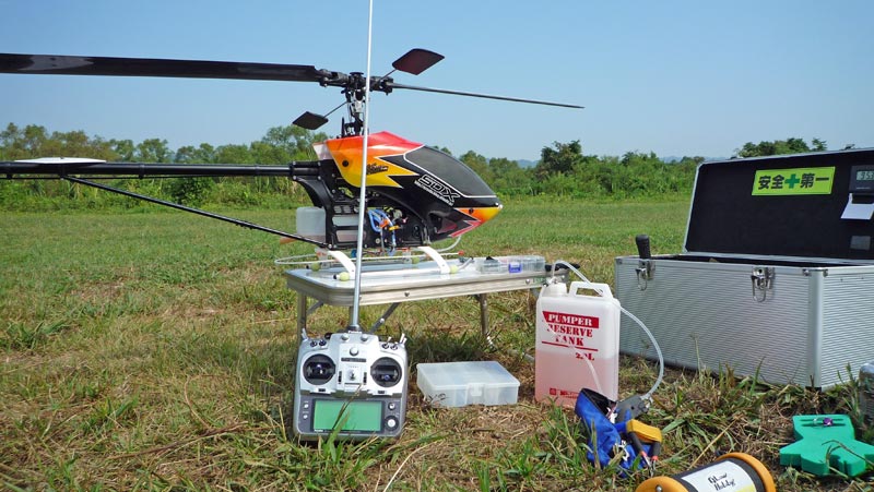 勢いに乗って180°オートロも逆方向でと企みましたが、練習中にローター回転が死にかけとなってしまい危うく地面にダイブしそうになったためHOLD解除しなんとか離脱。このまま続ければ墜落させかねませんので、燃料残分をホバリング練習にあて終了しました。ちょうど撤収準備をしていたときに、SDX新人さんが到着。その後果敢にも一人でホバリング開始。…しかし、離陸後10秒ほどでエレベーターを打 ち込み高度50cm程度で墜落。メインローター破損、S3151ギア欠けの憂き目に。ローターは僕が使わなくなったK&Sのエコノミーローターを 進呈。しかしギア欠けは補修部品もなくさすがに現場では無理。雑談して撤収となりました。