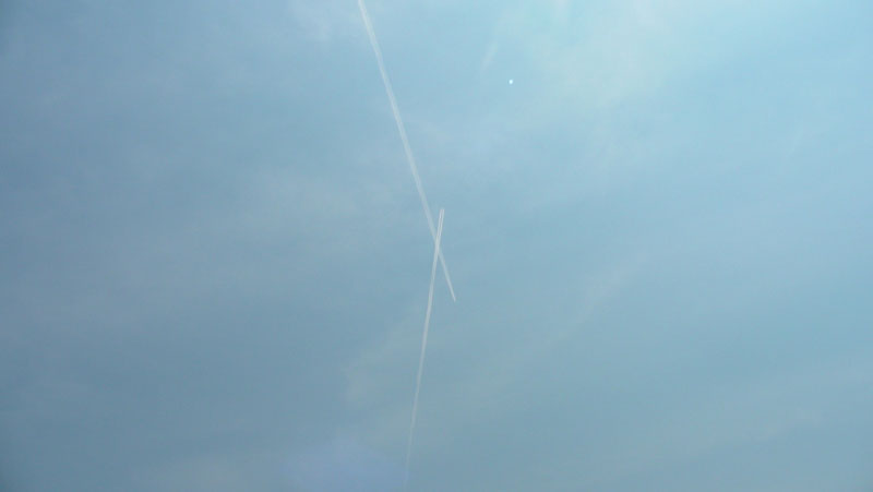 交差する飛行機雲。どれくらいの高度差があるのでしょう・・・。