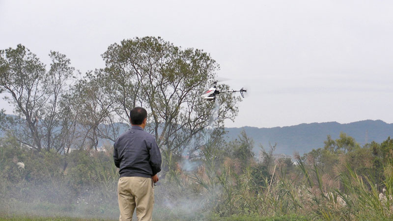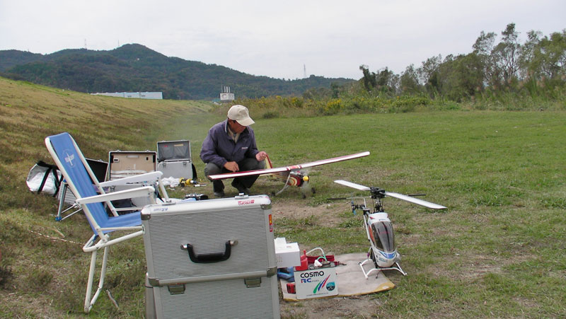 )なんかもやってみましたがまだまだ修行が足りないようです。続いて初号機。初の火入れのため、メイン2回転・中速2回転でスタート。ところがなぜだかヒートせず。???・・・よく見るとブースターケーブルが断線してしまったようです。Eさんにテスタを貸していただき確認。仕方ないので直接ヒートしました。どうせ上空はできないのでキャビンはせず裸で飛ばします(笑)甘めなので白煙はもうもうでしたが3タンクほど焚きあげて本日の慣らしは終了。最後に弐号機を再び。ところが今度はハンドポンプのギア欠けが発生