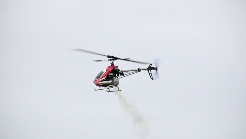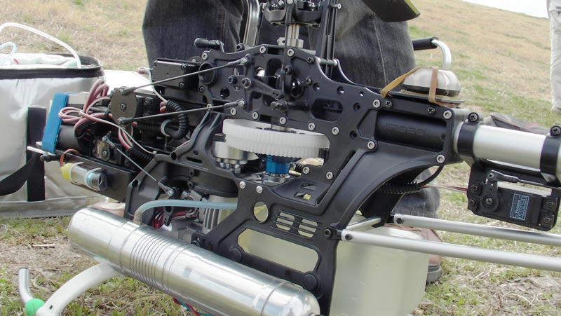 中でも目を引いたのが、前日背面オートロの失敗によりヘッド周りが逝ってしまったI戸さんのT-REX700です。なんとヘッド部分がBravoに変更されています。おそらく本邦初ではないでしょうか。補修パーツがなかったとのことで窮余の策ですが、それにしてもすごすぎます。スワッシュから上は完全にBravoです。スキッドもBravoのものに変更。実際に飛ばされていましたが、安定は相当良い様子。ただ、最近の俊敏な3D向きではないらしくI戸さんは少々ご不満のよう。マフラーが外れかけたり、 エンジンレギュレータ部分が外れかけたりといろいろトラブルはありましたが、無事終了。REX700とスタビ位置が違うため最後の必殺背面草刈りでスタビ パドルが逝ってしまいましたが、墜落もなく帰還されました。