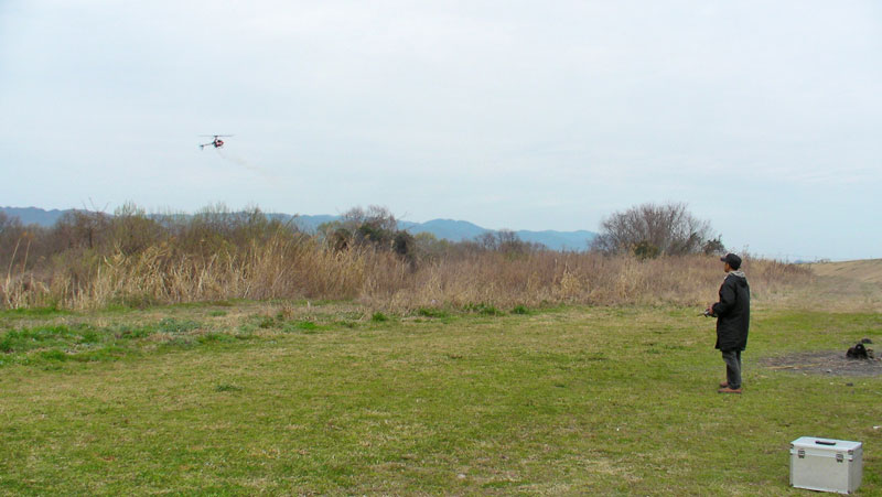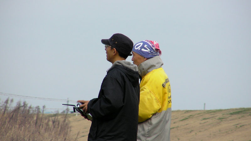 I 店主はスカディーを久しぶりにフライト。1ヶ月ぶりだそうです。そういえば、店頭にも燃料が入ったままのスカディーが長い間おいてありましたねぇ・・・。 途中、I戸さんの言う【サービスフライト】が発生。高度数mの低空で機体があらぬ方向に向き、非常に不安定となりました。あわやギャラリーに突っ込んでくるかと思ったその瞬間、I店主・・・身じろぎせず冷静にコントロール続行。