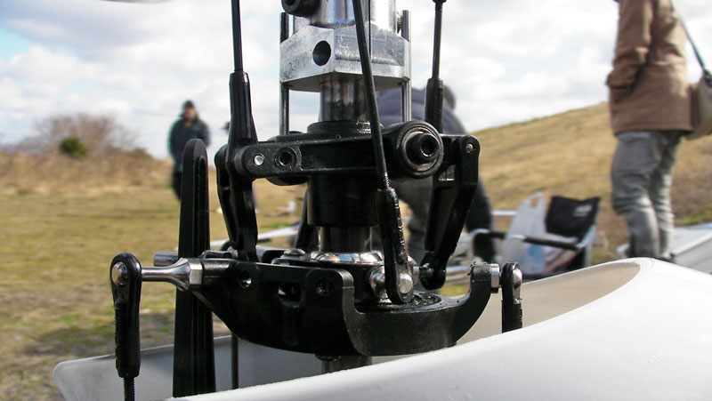 気を取り直し、テールローターを組み付け後、フライトさせるとまずまずの感じで飛んでくれました。全バラのせいか、トリムが今までの初号機と違うので飛ばしにくい感じですがまた馴れるかと思います。続いて弐号機を。その前に以前から気になっていたスタビライザーの水平面が出ない現象に関し、W林さんのご指導を仰ぐことに。ところがここでEさんが重大な事案を発見。なんと・・・
