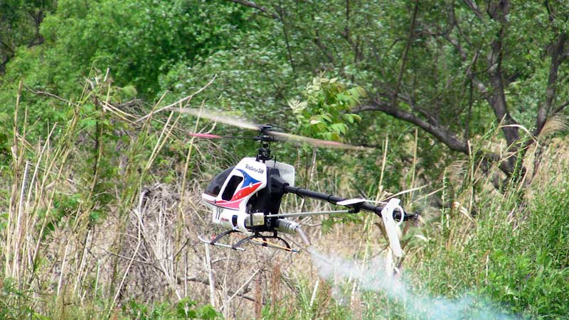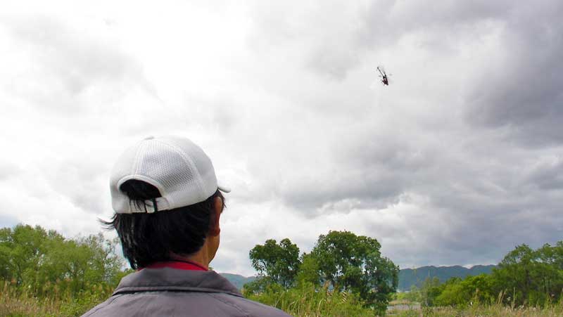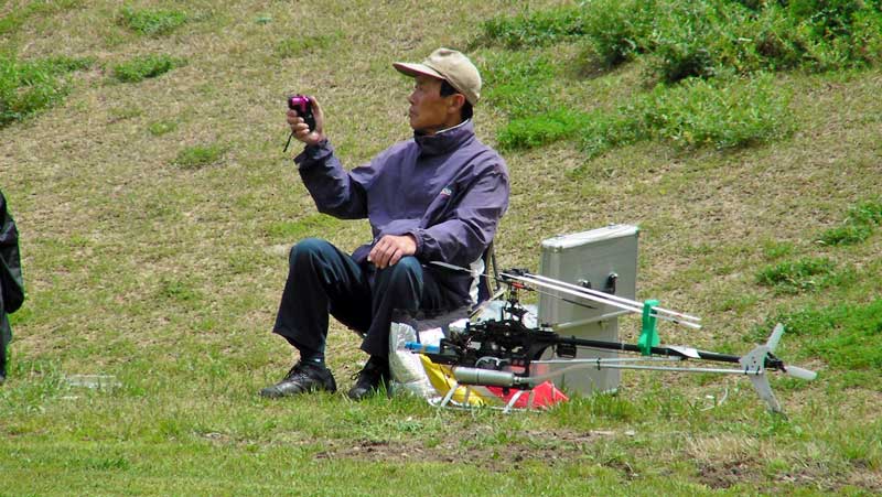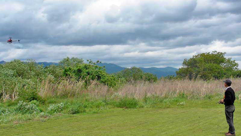 が強いためか飛行機はあきらめたようで、数年前に買ったままお蔵入りしていたという京商のベンチャー50です。数年ぶりにエンジ ンをかけたようですが、無事始動しホバリングされていました。やや大振りの機体のためか安定性が良いようにおもいました。途中、草にローターが接触。木製ローターでしたのでシュリンク部分が割けてしまい終了されました。