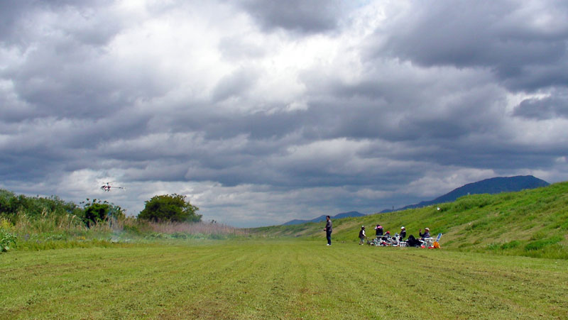 K さんはT-REX600Nを飛ばしましたが、やはりこの風。無難に飛ばされていました。また、H中さんは先日フレームまで逝ってしまったスカディを修理して持参。前回、クーリングファンがダメでオーバーヒート気味だったようですが、今回はそれも改善されずいぶんパワーが上がったとの由。ただ、エンジンがかかると異様な音がするのはなぜでしょうか・・・。(エンジンのベアリングが問題ないとすれば)クラッチベル付近のベアリングっぽい音のような気が・・・。