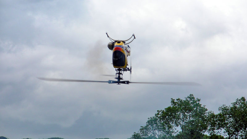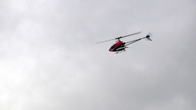 になりました。ちょうどお昼頃に終了、午後からは皆さん適宜飛ばされました。今日はSDXのシェイクダウン日。先日来組み立ててきたSDXの初フライトです。エンジンはYS50ST。スカディ弐号機(退役)から取り外したものですのですでに慣らしは終わっており、久々の火入れです。エンジンは特に問題なくかかり、無事浮上。ラダーも問題なさそうです。軽くホバリングさせてみます が、思った以上に安定している感じ。ピッチ・スロットルカーブ共に大きな問題はなさそうです。続いてアイドルアップ。今日は常時風速5〜6m/sec程 度、時に10m/sec程度の突風が吹きすさぶ厳しい環境でしたのでかなりコントロールが難しかったのですが、エンジンの調子がまずまずのためか意外にいい感じで飛んでくれます