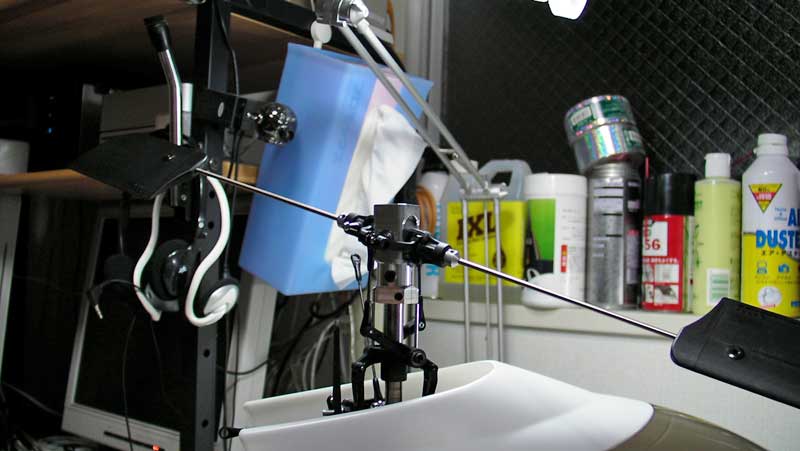 ※帰宅後SDXの調整に。スワッシュ設定を行ってみるとスタビパドルの平行がとれていないことが判明。たいした角度じゃないですが、気になるので調整しよ うとしたところイモねじが硬すぎてなめてしまう始末。おまけにそのまま外そうと頑張ってみるとスタビバーが折れてしまうという惨事に・・・。墜落してない のにこのザマはいったい・・・