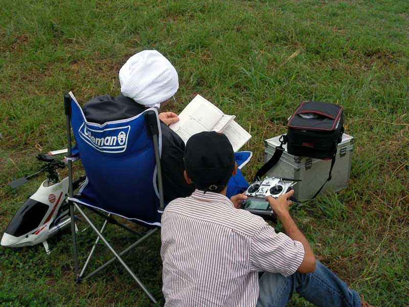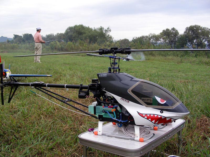 早速フィールドに出し、エンコンを上げていきます。メインローターも回り始めマフラーからの排煙も一段と強くなります。その後無事にホバリングへ。ちょっ と回転数が高めですが、ピッチは問題なさそうです。トラッキングもまずまず。スロットルレバーの調整かプロポ側でのスロットルカーブの調整が必要そうで す。バッテリのことも心配だったので2/3タンク程度の慣らしでいったん終了。受信機側・送信機側のバッテリはともにまだ大丈夫そうです。