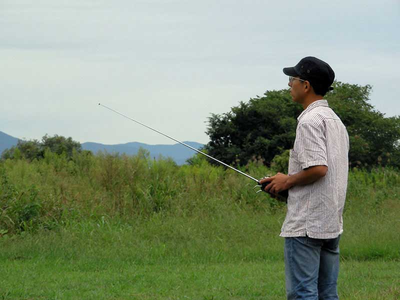 飛行場に着くとすでに2台の車が。いそいそと堤防を降りていくと飛行機のYさんとTさんのお二人。久しぶりの再会です。ちょうどTさんが飛ばすところでした。飛行機のお二人はどちらもすでに電動機オンリーとなっていて、GP機は撤廃された様子。近年のモーターやバッテリーの進歩で時にはGP以上の飛びを見せるそうです。飛行機の場合は固定翼なので風切音が気持ちよく、EPでもいい感じです。バッテリの関係上連続して飛ばすことができないのが玉に瑕、といったところでしょうか。EPヘリは・・・きれいに飛ばせますが迫力はイマイチかなぁ・・・。ジェットエンジンなら面白そうですが