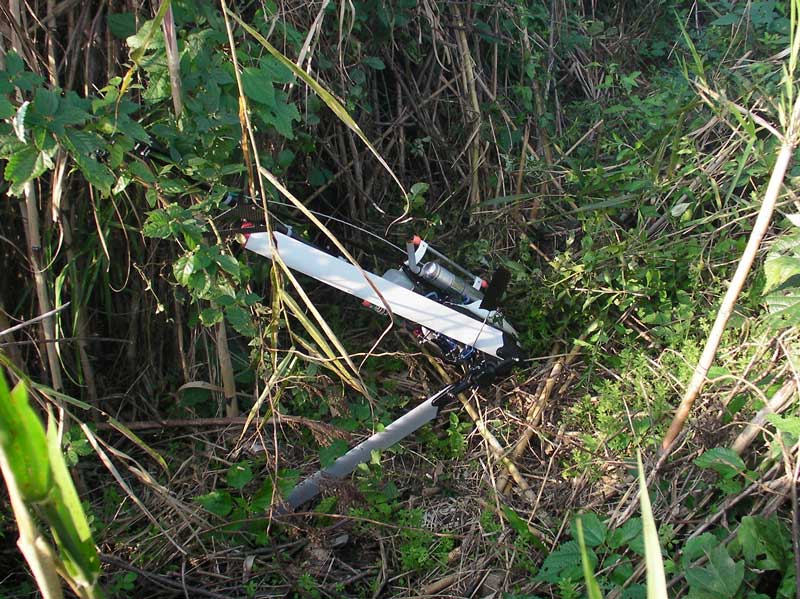 かなり手前での墜落でしたので回収は容易でした。また、結構派手な音がした割には程度も軽く、一安心。メインマストやスピンドルは交換でしょうが、いつも折れるメカマウント部などは無傷。キャビンも意外に元気でした