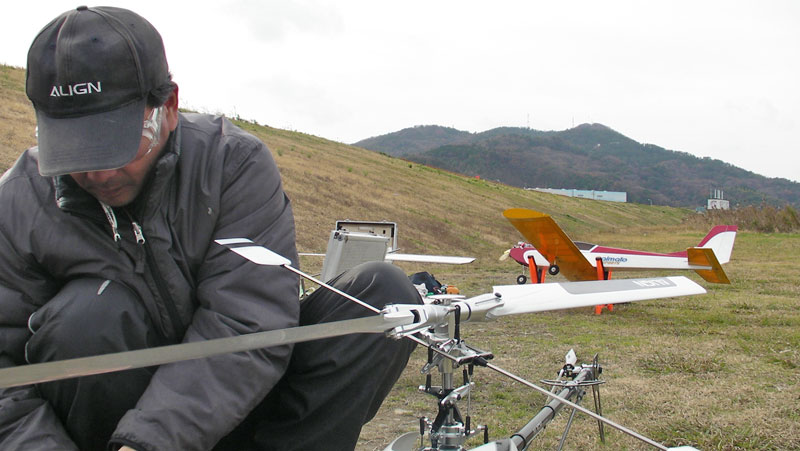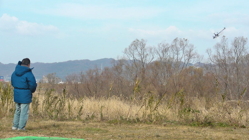 。しかし曇り空なので視認性は…言うに及ばず。弐号機はテールローターをALIGN95mmカーボンローター(白)に変更しましたが、増速プーリー(125%)の効果も相まって、ハンチングがひどくなりジャイロ感度を下げないととてもじゃないですが飛ばせなくなってしまいました