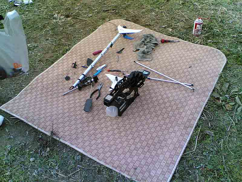 フレームも損傷していたMさんの機体は現場でほぼバラバラに分解され、水没したサーボなどの電子部品も解体し乾燥、エンジンもケース割れだったのでオーバーホール行きとなりました。ベアリングが錆びてくるので油を注しながらの解体でした。また復活することを期待してます。