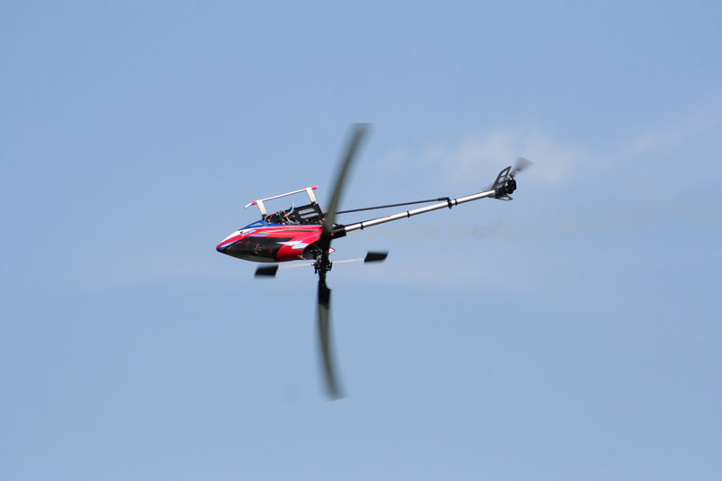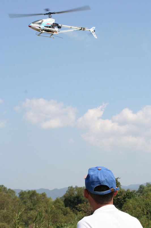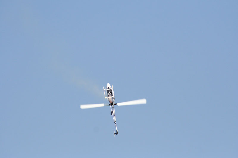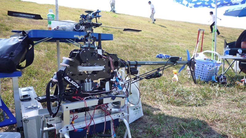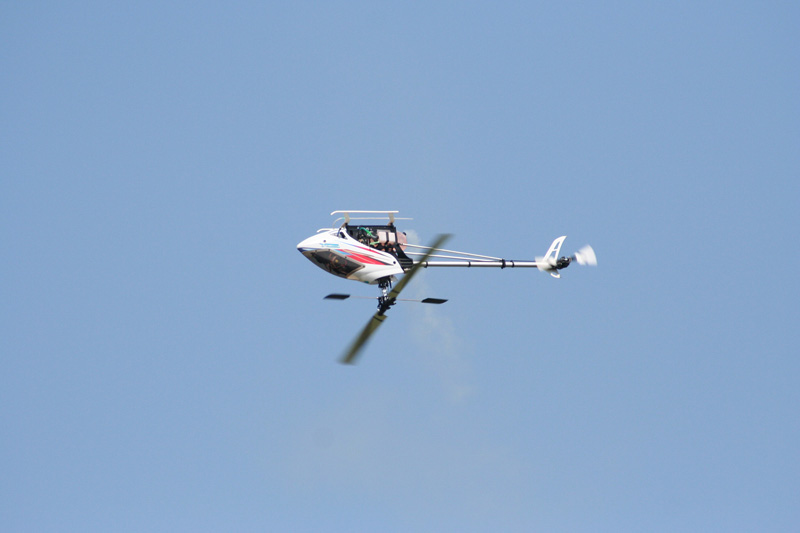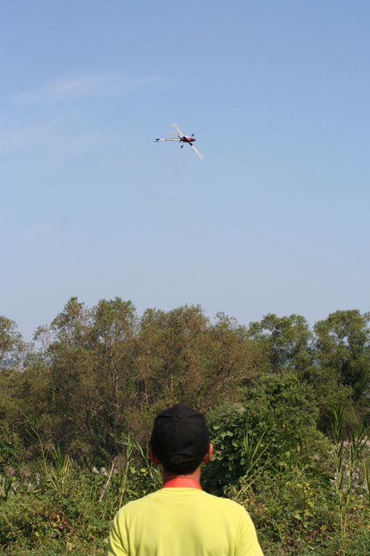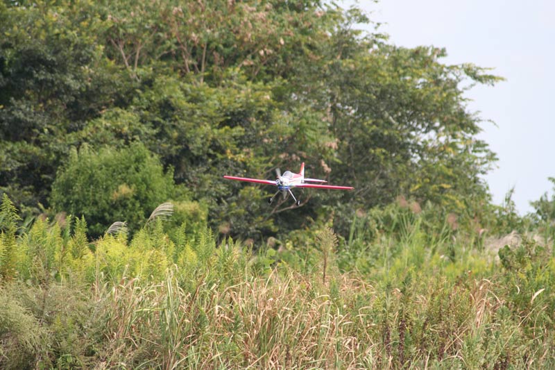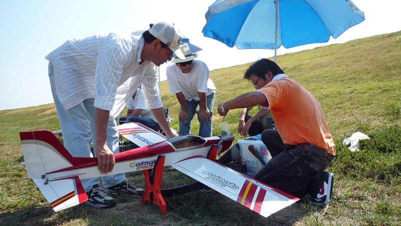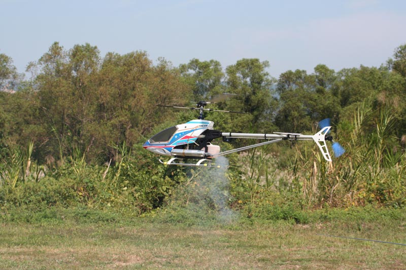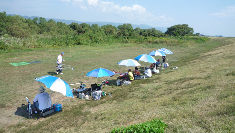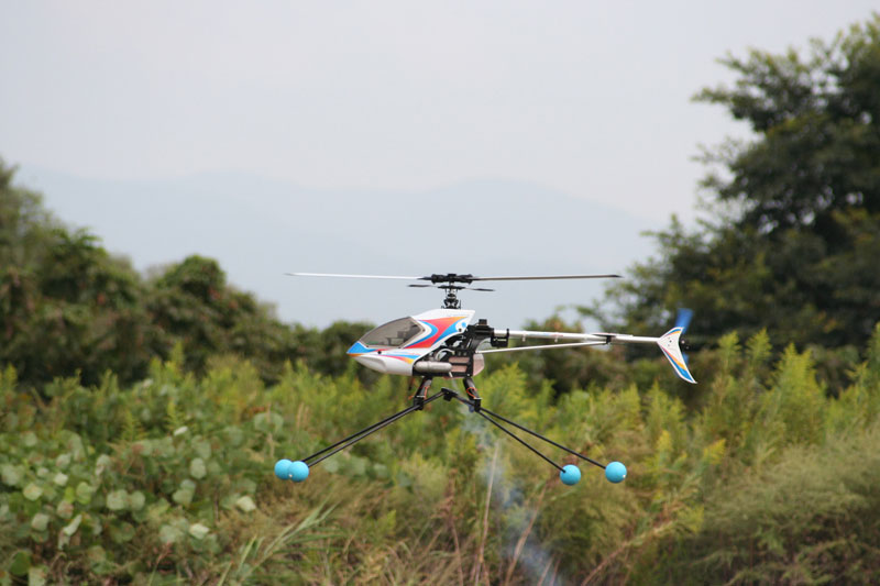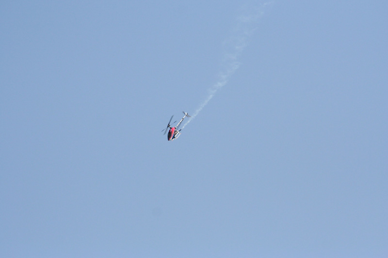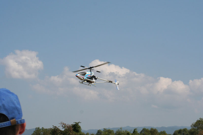音はやや甲高い目ですが、そこがまた2スト!という感じでよろしいです(笑) K村さんはカルマートのエンジンがやや焼け気味。ニードル調整でちょっとマシになりましたが、ヘッド部分からオイルが少しずつにじみだしてきています。圧縮漏れでしょうか?今後の解明が待たれます。 また今日は珍しく遠方からM先生がお弟子さんを連れて来場。R/C AirWorldにも記事を連載されている方です。T-REX600EPを使い、自動姿勢制御など難しいことをされておられました。 Y2さんはアイドルアップを入れないままT-REX450でループに挑戦。残念ながら失速気味に藪の中へ墜落しましたがほぼ無傷で回収できました。残念ながらループは拝見できませんでしたが、高度を取り機速さえあれば問題ないと思います(^^)/