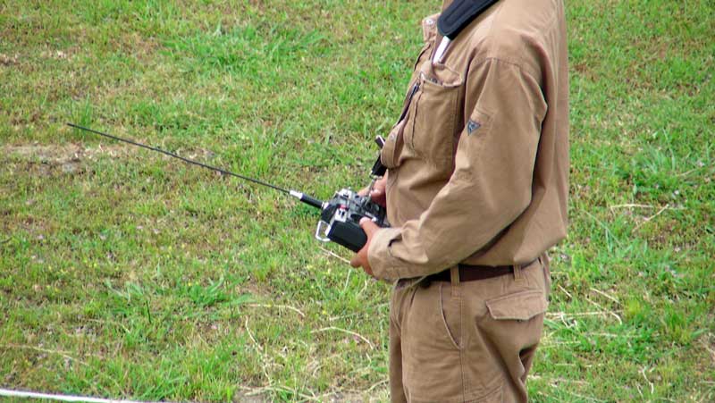 。斜面作業中のずり落ちを自動で補正する機能もあるようでかなりハイテク化されています。プロポは質実剛健な作りでしたが、始動操作以外はすべてこなせるようです。農機と言うよりは重機に近いのかも。ちなみに操作可能距離は約100m、使用周波数は73MHz帯。オペレーターがくわえタバコ